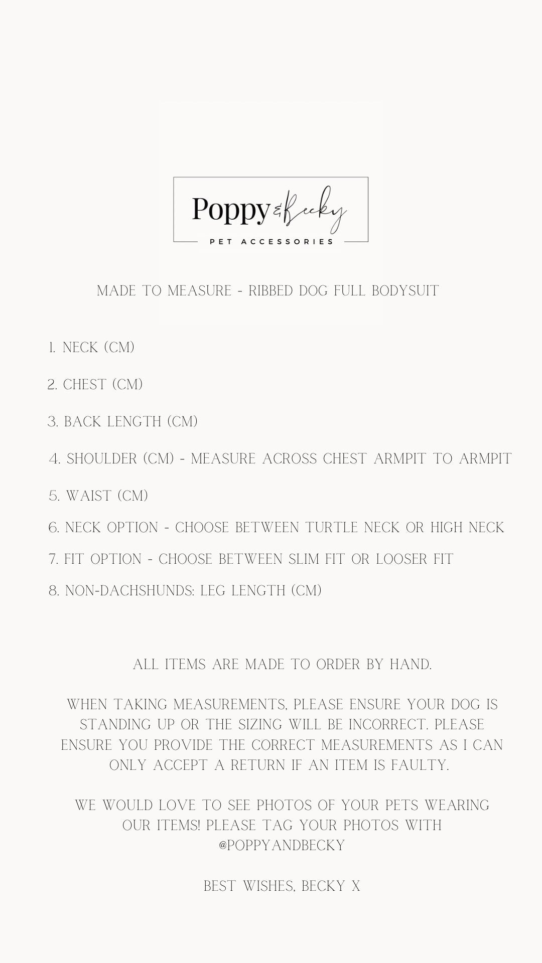 Please leave your dogs measurements at the note page upon checkout. As all items are custom to your dogs measurements, please ensure that measurements are correct as we can only offer a refund where an item is faulty.